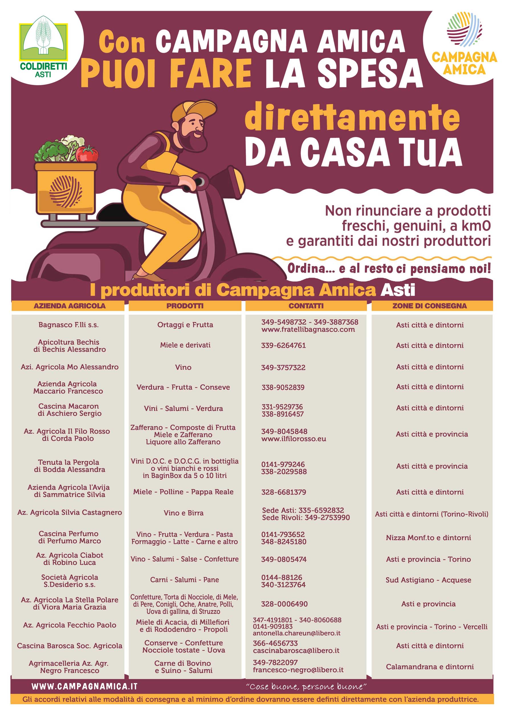 Aumentano le aziende agricole che propongono la consegna della spesa al domicilio dei consumatori, grazie alla rete Coldiretti Campagna Amica. In provincia di Asti si sono aggiunti altri tre produttori, portando l'elenco a 16 aziende agricole, un numero considerevole per un territorio piuttosto ristretto come l'Astigiano. Si tratta dell'Azienda Agricola Fecchio Paolo di Aramengo, Cascina Barosca Società Agricola di Castelnuovo D. B. e dell'Agrimacelleria Azienda Agricola Negro Francesco di Calamandrana. Diventano così 16, con un'offerta veramente completa e a chilometri zero: dalla carne ai salumi, dagli ortaggi alla frutta, dai formaggi alla pasta, dal pane al miele, dal vino alle confetture, dalle uova alle nocciole fino allo zafferano.