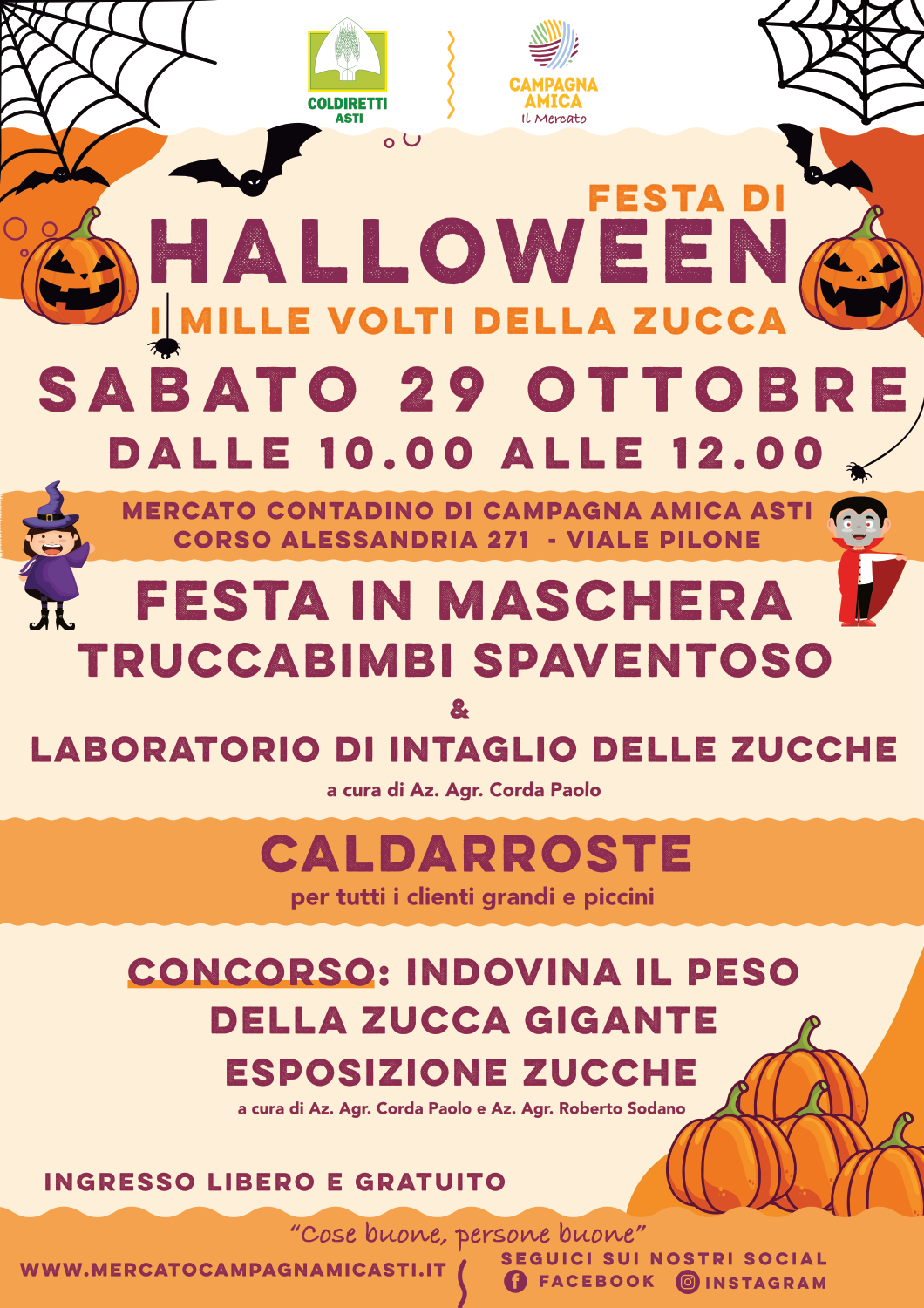 Il mese di ottobre chiuderà, sabato 29, con la Festa di Halloween ed i mille volti della zucca (dalle ore 10 alle ore 12) e la Festa in Maschera con truccabimbi spaventoso oltre al laboratorio di intaglio delle Zucche a cura dell’Azienda Agricola Corda Paolo. Alle ore 12 Caldarroste per tutti. In parallelo (ore 11) “Un’ora con l’Azienda Agricola Guido Vada” di Coazzolo con la degustazione di: Barbera d’Asti “Tanguera” 2020, Moscato vinificato secco Moscabianca Escamotage e Moscabianca Limited Edition Escamotage. In abbinamento, i prodotti agroalimentari del Mercato Contadino di Campagna Amica Asti.
