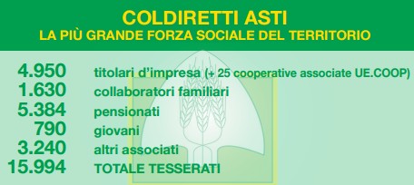 Anche il direttore di Coldiretti Asti, Antonio Ciotta, sottolinea la funzione sociale di un'organizzazione punto di riferimento dell'intero sistema economico territoriale: “Rappresentiamo il 75% delle imprese agricole astigiane e questo, recentemente, si è anche tradotto in una nuova forma di rappresentanza in cui Coldiretti è sempre più sindacato imprenditoriale di filiera. Insieme alle aziende artigiane e industriali d’eccellenza, si sta costruendo una sorta di alleanza per la realizzazione di accordi economici e impegni concreti finalizzati ad assicurare la massima valorizzazione della produzione agricola, anche attraverso la stipula di contratti di filiera sostitutivi dell’ormai superata stagione della sterile interprofessione”.