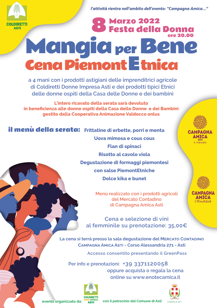 Per l’occasione è organizzata la conviviale “Mangia per Bene – Cena PiemontEtnica” a base di prodotti agroalimentari astigiani delle imprenditrici di Donne Impresa Coldiretti, in abbinamento a portate etniche d’oltre Mediterraneo. Ai fornelli si uniranno esperienza e abilità italiane e marocchine, per una proposta interculturale dei sapori della tradizione. Per Donne Imprese i piatti saranno firmati da Giovanna Soligo e da Barbara Zavattero, mentre per la cucina della tradizione marocchina si tratterà di una piacevole sorpresa tutta da scoprire. Una serata da gustare, ma anche da ascoltare nei racconti delle chef astigiane e marocchine.
