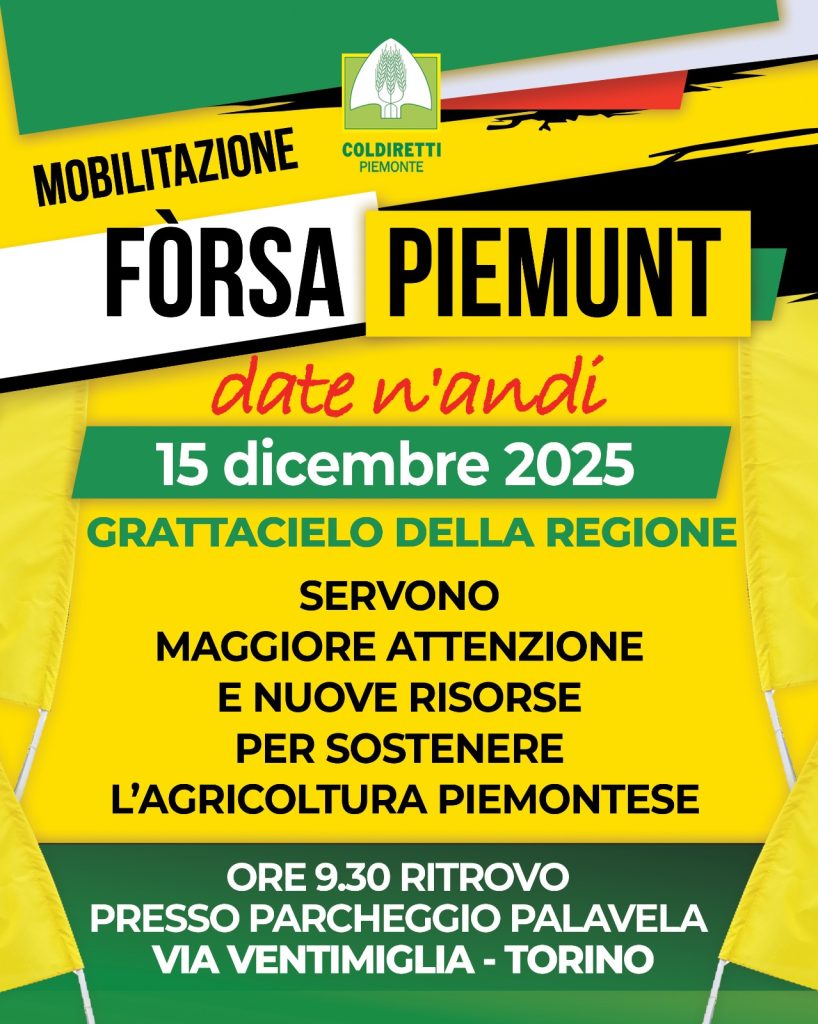 L’appuntamento è per lunedì 15 dicembre 2025 con ritrovo alle 9.30 al parcheggio del Palavela, in via Ventimiglia, per arrivare, poi, sotto il grattacielo della Regione, in piazza Piemonte. Con il Presidente di Coldiretti Piemonte, Cristina Brizzolari, il Delegato confederale, Bruno Rivarossa, il Presidente di Coldiretti Asti Monica Monticone e il Direttore Giovanni Rosso, ci saranno l’intera giunta regionale e migliaia di agricoltori da tutte le province della regione.